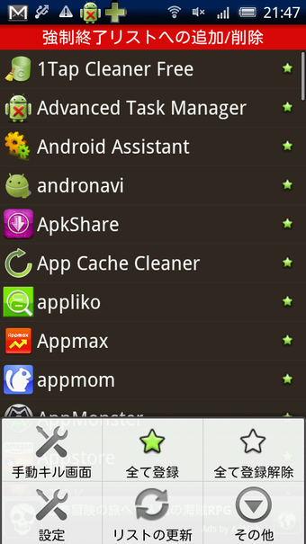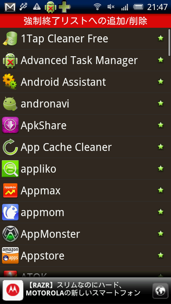 Automatic Task Killerの使い方は非常に簡単です。起動するとアプリの一覧が表示されます。基本的な操作はスリープ状態で終了させたいアプリを選択するだけです。選択されたアプリは画面右端に星印が表示されます。あとはスリープ状態に入れば自動的にタスクを終了しメモリーが解放されます。複雑な操作は全く必要なくいつでもAndroidを最適な状態に保てます。解放されたメモリー容量はスリープから復帰時に通知として表示されます。また手動でアプリを選択して強制終了する機能も用意されています・「設定」により「手動キル画面」に切り替えると利用できますので、自動で終了できないアプリがあった場合などは手動でタスク終了を行うといいでしょう。